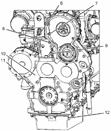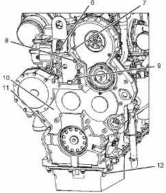 檢查凸輪軸齒輪與可調(diào)節(jié)惰輪齒輪組件之間的齒隙。 此齒隙應(yīng)為 0.356 ± 0.254 mm (0.014 ± 0.010 in)。 參考測試和調(diào)整, "齒輪總成(前)- 正時",以了解齒隙調(diào)整步驟。擰緊螺母 (12) 和螺栓至扭矩為 55 ± 10 N·m (41 ± 7 lb ft)。