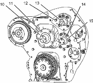 注: 如果卸下軸組件,跳過步驟 12。 需要重新調(diào)整凸輪軸齒輪和可調(diào)惰輪的齒隙。 請參閱測試與調(diào)整, "齒輪總成(前)- 正時"。