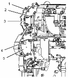 將齒輪組組件 (1) 安置在樞軸上。確保對準(zhǔn)塔齒輪組件與曲軸齒輪上的正時標(biāo)記。