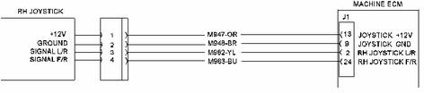 該診斷代碼與右操縱手柄前進(jìn)和后退位置傳感器有關(guān)。 FMI 13 表示 ECM 已確定傳感器的信號(hào)不在預(yù)期限定范圍內(nèi)。