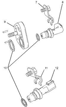 發(fā)動機速度 / 正時傳感器 (7) 支架 (8) 輔助發(fā)動機轉速 / 正時傳感器 (9) 安裝板 (10) O 形密封圈 (11) 支架 (12) 主轉速 / 正時傳感器 |