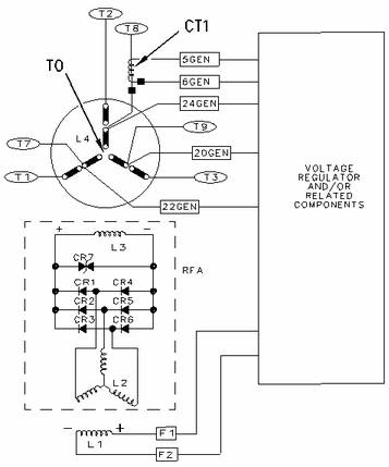卡特彼勒SR4B 發(fā)電機自勵磁發(fā)電機配線圖 (CR1-C6) 二級管 (CR7) 變阻器 (L1) 勵磁機磁場(定子) (L2) 勵磁機電樞(轉(zhuǎn)子) (L3) 主磁場(轉(zhuǎn)子) (L4) 主電樞(定子) (RFA) 旋轉(zhuǎn)磁場總成 (CT1) 選裝的電壓降變壓器 (T0、T1、T2、T3、T7、T8、T9) 發(fā)電機端子 |