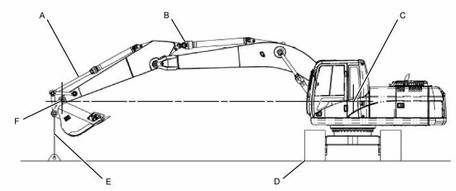 機(jī)器的基本位置 (A)鏟斗油缸完全伸出 (B)斗桿油缸完全收回 (C)動(dòng)臂座架中銷的位置 (D)履帶位置 (E)鏟斗的固定位置 (F)斗桿鼻端中銷的位置 |