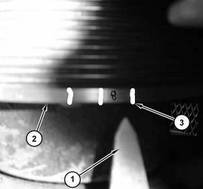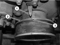 順時針緩慢轉動曲軸,使在步驟8中作的減振器或皮帶輪(2)上的標記與指針(1)的尖部對齊。此時1號活塞位于壓縮沖程上止點。參考圖2和圖3。