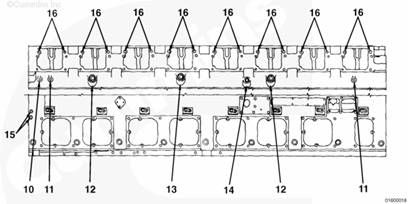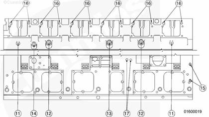 對缸體進行了改動以便能夠安裝較長的缸蓋螺釘。以前的康明斯發(fā)動機必須使用長度為 171 mm [6.73 in] 的螺釘?,F(xiàn)在的康明斯發(fā)動機必須使用長度為 203 mm [8.00 in] 的螺釘。短螺釘可用于維修。這些螺釘都是鍍鎘的(銀色或金色)。必須將這些短螺釘擰緊至 353 N•m [260 ft-lb]。如果短螺釘表面具有 lubrite 鍍層,而且顏色是黑色,則必須予以更換。203 mm [8 in] 螺釘只能使用 lubrite 鍍層。555 N•m [409 ft-lb] 扭矩必須施加在這些螺釘上。K50 康明斯發(fā)動機總是使用 203 mm [8.00 in] 螺釘。