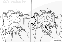 K38 康明斯發(fā)動機上的主軸承蓋編號到“7”,而 K50 康明斯發(fā)動機上則編號到“9”。將每個蓋安裝到正確位置中。“1”號蓋安裝在缸體前部。蓋中的軸承定位舌槽必須位于缸體中的槽的同一側(cè)。 |