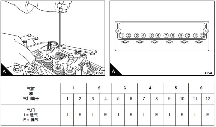 4設(shè)置1號(hào)氣缸的氣門(B1和B2)。然后檢查/調(diào)整6號(hào)氣缸的氣門(B11和B12)間隙。