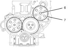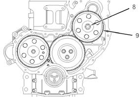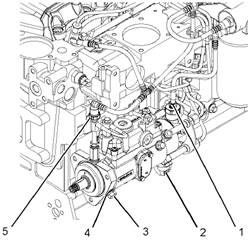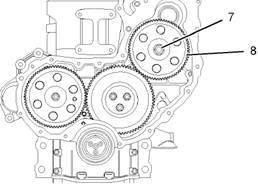 2.松開鎖緊螺釘(5)。轉(zhuǎn)動(dòng)隔套(6),以便將鎖緊螺釘(5)擰緊抵到噴油泵的軸上。逆時(shí)針方向轉(zhuǎn)動(dòng)噴油泵齒輪來(lái)消除齒隙。將鎖緊螺釘(5)擰緊至扭矩17N·m(13lbft)。