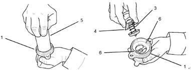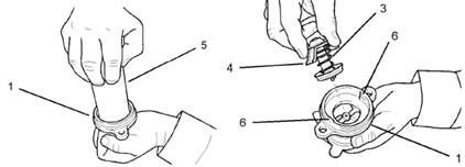 4.將27610226節(jié)溫器工具(5)安裝到水溫調(diào)節(jié)器殼體(1)中。推壓工具(5)以擠壓擋圈(4)。旋轉(zhuǎn)工具(5)以將水溫調(diào)節(jié)器(3)從水溫調(diào)節(jié)器殼體(1)的凸舌片(6)上分離。從水溫調(diào)節(jié)器殼體(1)上拆卸工具(5)。從水溫調(diào)節(jié)器殼體(1)上拆下水溫調(diào)節(jié)器(3)。
