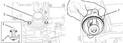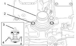 3.拆下將水溫調(diào)節(jié)器殼體(1)在缸蓋上固定到位的調(diào)整螺釘(2)。卸下水溫調(diào)節(jié)器殼體(1)。拆下水溫調(diào)節(jié)器殼體(1)的O形圈。棄置O形圈。