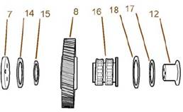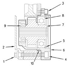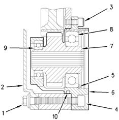 4.將前殼體(6)的法蘭盤(pán)放置到一個(gè)合適的支座上。從前殼體(6)推壓出齒輪(7)以及軸承(8和9)的組件。為了從齒輪(7)拆下軸承(8和9),使用一個(gè)合適的拉拔器。