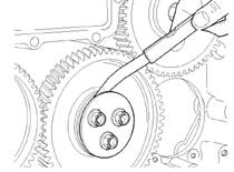 10.檢查惰齒輪和曲軸齒輪之間的齒隙。更多信息,請(qǐng)參閱《技術(shù)參數(shù)手冊(cè)》,“前齒輪總成”。