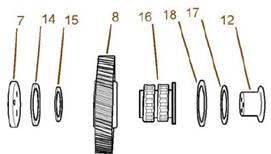 7.解體惰齒輪(8)的組件(9)和輪轂。為了解體標(biāo)準(zhǔn)組件(9),將輪轂(12)滑出惰齒輪(8).檢查惰齒輪(8)中的襯套(13)有無(wú)磨損或損壞。如有必要,從惰齒輪(8)的每側(cè)拆下襯套(13)。