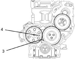 2.確保1號(hào)氣缸仍處在其壓縮沖程的上止點(diǎn)位置。如有必要,請(qǐng)參閱《Perkins1103/1104柴油發(fā)動(dòng)機(jī)測(cè)試和調(diào)整手冊(cè)》,“查找1號(hào)活塞的上止點(diǎn)位置”。確保安裝了曲軸正時(shí)銷(xiāo)(3)和凸輪軸正時(shí)銷(xiāo)(4)。