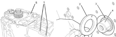 1.徹底清潔缸體上前齒輪室的配合面。將兩個(gè)臨時(shí)用雙頭螺柱(1)裝入缸體中。確保止推墊圈(2)與空心定位銷(xiāo)(3)對(duì)齊。將止推墊圈安裝到凸輪軸(4)上。將新的接頭(5)安裝到缸體上。