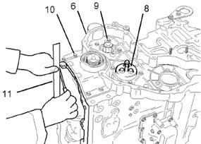 6.從缸體凹槽(10)中拆下惰齒輪(8)的組件(9)。向前移動(dòng)組件時(shí),必須將組件(9)吊到曲軸前油封(11)殼體的上方。
