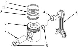 1.用一個(gè)合適的活塞環(huán)擴(kuò)張器從活塞(6)上拆下活塞環(huán)(1)和(2)及控油環(huán)(3)。從連桿蓋上拆下連桿下軸瓦。從連桿上拆下連桿軸承上軸瓦。
