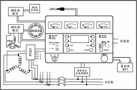由外部的電壓/電流互感器(PT/CT)模塊將發(fā)電機電壓降至18VAC,并經(jīng)由電流互感器(CT)輸出電流產(chǎn)生一個參考交流電壓,通過電壓調(diào)節(jié)向調(diào)壓器輸出模塊輸出一個低功率PWM信號,然后向勵磁機定子輸出一個放大信號。機油、冷卻液和排煙溫度由可變電阻傳感器傳送信號,機油壓力由電容式傳感器傳送信號。