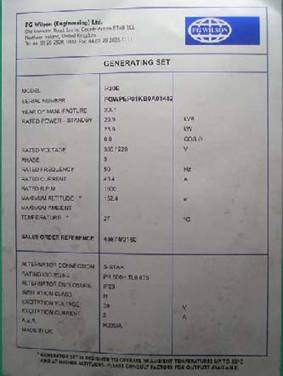 每一臺柴油發(fā)電機組都有一個銘牌,它被粘貼在主交流發(fā)電機的外殼上或機組控制屏的背后。銘牌上的資料用于鑒別該機組的型號、編號及簡單技術(shù)特性,如額定轉(zhuǎn)速、額定電壓、電流和額定頻率、額定功率、額定功率因數(shù)及機組的標準測試條件如環(huán)境溫度和海拔高度等。為了向用戶提供更詳細參考,一些資料還會重復(fù)在隨本手冊附送的技術(shù)數(shù)據(jù)表內(nèi)。