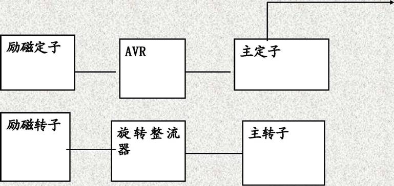 柴油機著車并帶動發(fā)電機旋轉(zhuǎn),主轉(zhuǎn)子的剩磁產(chǎn)生一個小的交流電壓加到主定子上,AVR將其整流轉(zhuǎn)為直流并將其加到勵磁定子上。此直流電和勵磁定子間就產(chǎn)生一個磁場,磁場又依次在勵磁轉(zhuǎn)子上感應(yīng)出一個交流電(AC),此AC又由旋轉(zhuǎn)整流器轉(zhuǎn)變?yōu)橹绷麟?。?dāng)這直流電壓經(jīng)過主轉(zhuǎn)子時,就產(chǎn)生一個比原來的剩磁強大的磁場,因而在主定子上感應(yīng)出一個較高的交流電壓。這個較高的交流電壓循環(huán)通過系統(tǒng)感應(yīng)出更高的直流電壓回到轉(zhuǎn)子,這樣循環(huán)往復(fù)直到產(chǎn)生一個接近發(fā)電機的額定輸出電壓,在此時AVR開始限制通向勵磁定子的電壓,因而穩(wěn)定了發(fā)電機組的額定輸出電壓。
