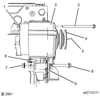 5.安裝支架(9),然后將螺栓和墊片(6)安裝到交流發(fā)電機(jī)(2)上,用手?jǐn)Q緊。