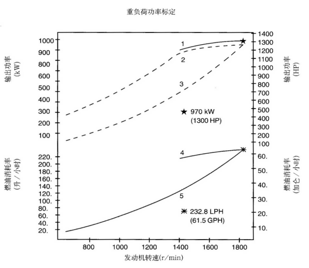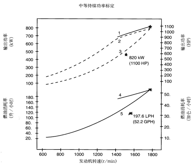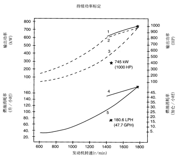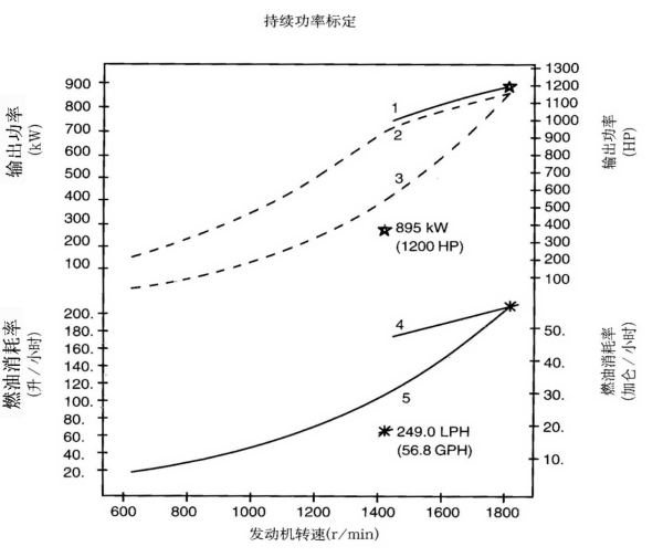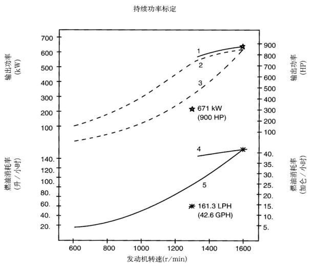 標(biāo)定條件:功率標(biāo)定是基于ISO8665標(biāo)準(zhǔn)規(guī)定的條件:大氣壓力為100kPa (29.612英寸汞柱),環(huán)境溫度為25℃(77°F),相對濕度為30%。螺旋槳軸功率為按97%扣除齒輪箱損失后的凈功率。燃油消耗是基于使用比重為838.9g/l(7.001磅/加侖),LHV為42780kJ/kW(18390Btu/lb)的35°API燃油。 1. 制動功率 kW(HP) 4. 軸功率對應(yīng)的燃油消耗 2. 扣除齒輪箱損失后的軸功率 kW(HP) 5. 螺旋槳推進(jìn)曲線對應(yīng)的燃油消耗 3. 螺旋槳推進(jìn)曲線 持續(xù)功率:這種功率標(biāo)定的發(fā)動機(jī)允許在全負(fù)荷工況下連續(xù)不斷地使用。這種功率為ISO3046標(biāo)準(zhǔn)功率 * 對非LTA發(fā)動機(jī),其燃油耗高1-3%。 | |||||||
