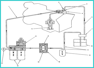 1. 高壓油泵進(jìn)油管 2. 減振器 3. 回油節(jié)流孔 4. 高壓油泵 5. 回油管 6. 噴油嘴 7. 連接塊 8. 手動(dòng)注油泵 9. 注油旁通閥 10. 燃油箱 11. 進(jìn)油管 12. 燃油粗濾器(CWR 沒有) 13. 燃油壓力表 14. 燃油細(xì)濾器 15. 溢流閥 16. 燃油輸送泵