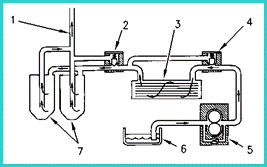 1. 去主油道的管路 2. 機(jī)油濾清器旁通閥 3. 機(jī)油冷卻器 4. 機(jī)油冷卻器旁通管 5. 機(jī)油泵 6. 油底殼 7. 機(jī)油濾清器