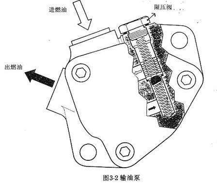 輸油泵由一對內(nèi)嚙合的齒輪構(gòu)成,泵內(nèi)部裝有限壓閥。低壓油路中的壓力穩(wěn)定對柴油機(jī)的功率輸出是至關(guān)重要的。發(fā)動機(jī)的功率不足時首先就應(yīng)檢查低壓油路的壓力。另外回油閥閥芯銹蝕或彈簧失效是造成柴油機(jī)不能啟動的重要原因之一。