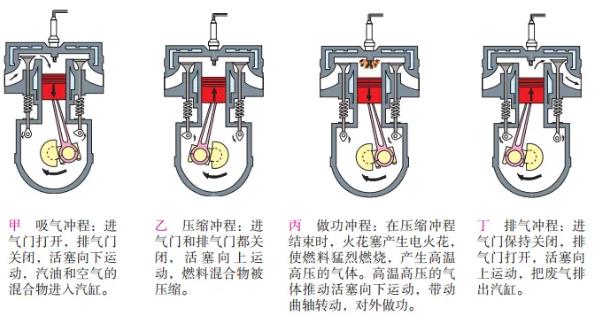 ③兩種發(fā)動(dòng)機(jī)運(yùn)轉(zhuǎn)的第一循環(huán),都必須靠外力使曲軸旋轉(zhuǎn),才能完成進(jìn)氣和壓縮行程;做功行程開始后,做功能量?jī)?chǔ)存在飛輪內(nèi),以維持循環(huán)繼續(xù)進(jìn)行。