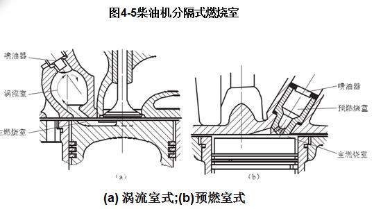 分隔式燃燒室由兩部分組成:一部分位于活塞頂與汽缸蓋底面之間,稱(chēng)為主燃燒室;另一部分在汽缸蓋中,稱(chēng)為副燃燒室。兩部分之間有一個(gè)或幾個(gè)孔道相連。分隔式燃燒室常見(jiàn)的形式有渦流室式和預(yù)燃室式兩種,如圖4-5所示。