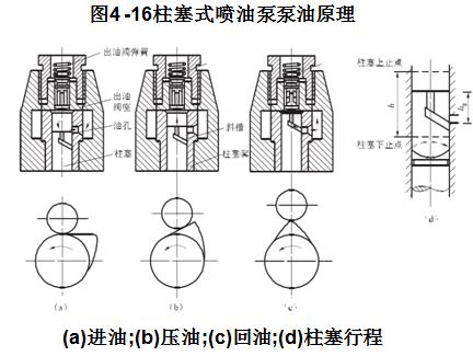 柱塞繼續(xù)上移,當(dāng)柱塞上的斜槽與油孔開始接通時(shí),泵腔內(nèi)的燃油便經(jīng)柱塞上的直槽、斜槽和油孔流向低壓油腔。這時(shí),泵腔中油壓迅速下降,出油閥在彈簧壓力作用下立即復(fù)位,噴油泵供油立即停止。此后柱塞仍繼續(xù)上行,直到上止點(diǎn)為止,但不再泵油(如圖4-16 (c)所示)。