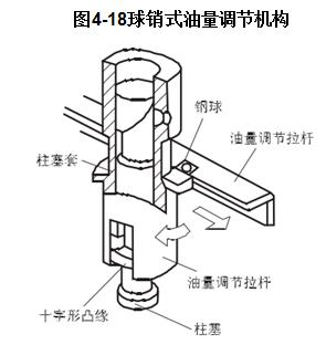 ②球銷式油量調(diào)節(jié)機(jī)構(gòu)如圖4-18所示。其工作原理與齒桿式油量調(diào)節(jié)機(jī)構(gòu)比較相似。油量調(diào)節(jié)套筒松套在柱塞套上,在下面缺口中嵌入十字形凸緣,其上部鑲嵌一個(gè)鋼球。在油量調(diào)節(jié)拉桿水平的直角邊上開有小槽,工作時(shí)槽口和油量調(diào)節(jié)套筒上的鋼球嚙合。當(dāng)移動(dòng)油量調(diào)節(jié)拉桿時(shí),槽口帶動(dòng)鋼球使調(diào)節(jié)套與柱塞一起轉(zhuǎn)動(dòng),從而達(dá)到調(diào)節(jié)供油量的目的。