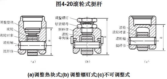 滾輪式挺桿有3種形式:調(diào)整墊塊式、調(diào)整螺釘式、不可調(diào)整式,如圖4-20所示。