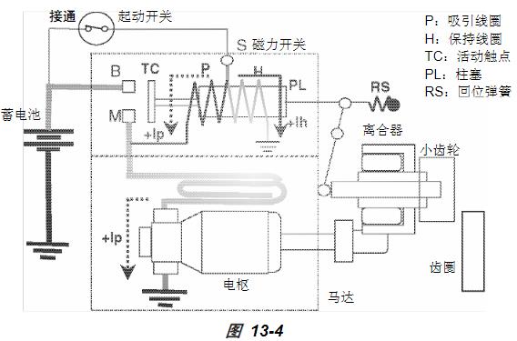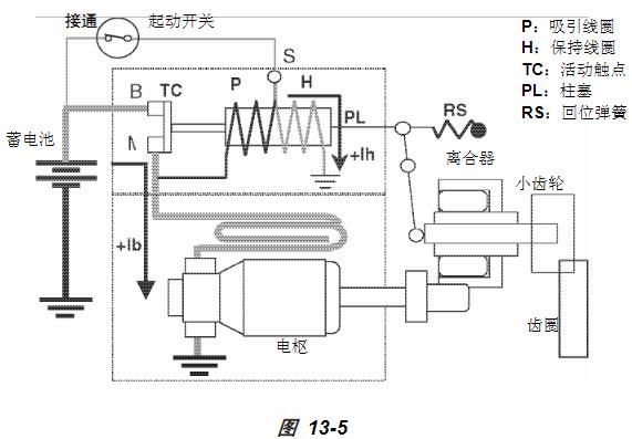 將鑰匙開關(guān)轉(zhuǎn)到起動(dòng) (START) 位置就會(huì)向 S 端子施加蓄電池電壓 Vb。從而,電流流過吸引線圈 P 和保持線圈 H(分別是 +Ip和 +Ih),兩個(gè)線圈都吸引柱塞 PL。因此,小齒輪沖出,與齒圈嚙合?;顒?dòng)觸點(diǎn) TC 同時(shí)與觸點(diǎn) B 和 M 接觸。