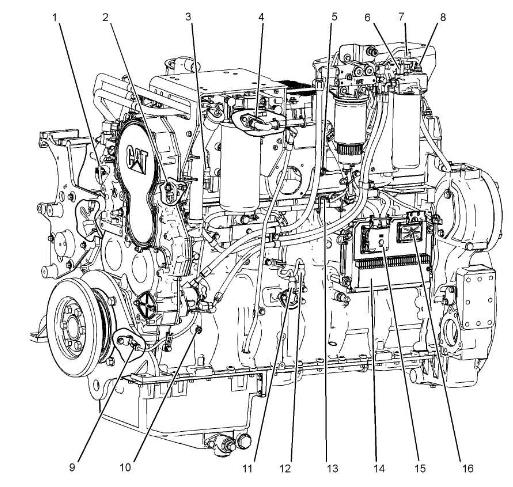 圖4發(fā)動機左側視圖(范例)(1) 發(fā)動機冷卻溫度傳感器(2) 次速度/時間感應塞(3) 進氣歧管壓力傳感器(4) 噴油器閥蓋進口接頭(5) 進氣歧管空氣溫度傳感器(6) 壓差開關(燃油)(7) 燃油壓力感應塞(8) 燃油溫度傳感器(9)主速度/時間感應塞(10) 正時校準口(11) 大氣壓力感應塞(12) 機油壓力感應塞(13) 正時校準探針接口(14) 發(fā)動機控制模塊(ECM)(15) J2/P2 ECM 接頭 (16) J1 ECM 接頭