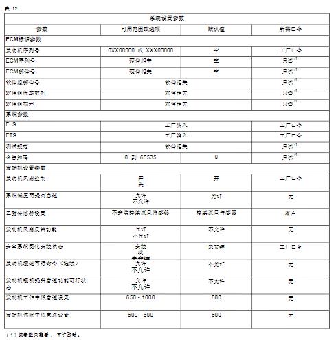 系統(tǒng)設置參數(shù)i02491439系統(tǒng)設置參數(shù)SMCS代碼:1901S/N:ZXT1-Up;LHX1-UpS/N:ASX1-Up;LHX1-UpS/N:ZBD1-Up;LHX1-UpS/N:AZW1-Up;LHX1-UpS/N:ZHC1-Up;LHX1-UpS/N:AWF1-Up;LHX1-UpS/N:XTR1-Up;RHX1-UpS/N:BXD1-Up;RHX1-UpS/N:XDC1-Up;RHX1-UpS/N:BXY1-Up;RHX1-UpS/N:BTX1-Up;RHX1-UpS/N:4091-Up;RHX1-Up系統(tǒng)設置參數(shù)是特別設定的發(fā)動機排放水平、功率范圍和特別應用的參數(shù)。參數(shù)的默認值由工廠編程設定。一些參數(shù)可以改變以適合發(fā)動機的特殊應用。如果電子控制模塊(ECM)更換,必須重新載入系統(tǒng)設置參數(shù)。如果你更新ECM快存文檔,則不必重新載入系統(tǒng)設置參數(shù)。某些設置參數(shù)被標記在發(fā)動機信息銘牌上。注意:如果受工廠密碼保護的參數(shù)被改變,卡特免除擔保責任。參數(shù)描述設備標識“設備標識”參數(shù)允許客戶向ECM輸入一些描述以明確發(fā)動機的應用。字段中最多能填入17個字符。