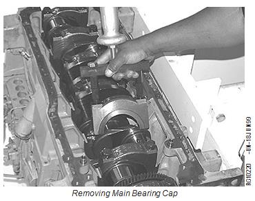 IMPORTANT: Before removing main bearing caps (A), check for proper torque on all main bearings. Also, check each bearing cap to make sure they are numbered for reassembly on the same numbered main bearing bosses. Keep matched main bearings with their respective main bearing cap for comparison with crankshaft journal (surface wear) from which removed.
