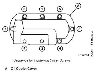 3. Tighten oil cooler cover (A) cap screws in sequence shown (1-8). Apply initial torque as follows: