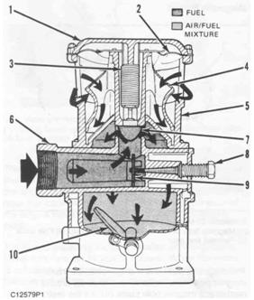 在不增壓卡特CAT發(fā)動機(jī)上,空氣流經(jīng)空氣過濾器進(jìn)入化油器空氣管道。在渦輪增壓卡特CAT發(fā)動機(jī)上,空氣被吸入卡特CAT發(fā)動機(jī),流經(jīng)空氣過濾器到達(dá)化油器渦輪增壓器,而后被推入后冷卻機(jī)核到達(dá)化油器空氣管道。在空氣管道中,空氣環(huán)繞氣閥體(5)流動,然后被推入隔膜(2),再向下流經(jīng)氣閥中央,環(huán)繞燃?xì)膺M(jìn)氣體(6),通過節(jié)流板(10)最后進(jìn)入卡特CAT發(fā)動機(jī)。