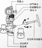 ①如(圖2)所示安裝爆壓表A前,用示功閥專用扳手打開示功閥B,然后,輕松開啟1-2次后關(guān)閉示功閥(目的是為了吹掉內(nèi)部污物以免造成爆壓表損壞)