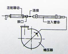 ③將注射器接口與另一端連接在增壓器進(jìn)口的注入管相連。