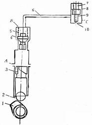 1-凸輪;2-滾輪;3-柱塞;4-出油閥;5-出油閥彈簧;6-高壓油管;7-噴油器彈簧;8-噴油器;9-針閥;10-噴油孔