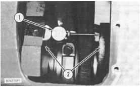 5. 曲軸旋轉(zhuǎn)大約300度時(shí)千分表讀取值的變化不能超過0.03毫米(0.001英寸)?,F(xiàn)在按相反方向轉(zhuǎn)動(dòng)曲軸使其回到起始位置。千分表在這時(shí)的讀取值必須為零。如果千分表并沒有讀取零,重復(fù)進(jìn)行以上程序。