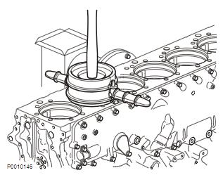 2 用活塞環(huán)夾子和連桿將活塞提升就位(大端軸承已潤滑)。確?;钊蛘_的方向(這樣,連桿便處于曲軸上的正確位置)。用錘柄向下敲擊活塞。當(dāng)活塞處于活塞環(huán)夾子下方時,拆下活塞環(huán)夾子。重新安裝缸套用壓緊工具。向下按壓活塞,使連桿接觸曲軸。安裝大端軸承蓋,將其與曲軸恰好對準(zhǔn)(大端軸承已潤滑)。安裝螺栓。扭矩緊固螺栓,檢查并確認(rèn)曲軸可以轉(zhuǎn)動。