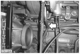 74 僅適用于 D13B-A/C/G/H/K/L,D13C2-A,D13C4-A(雙渦輪增壓器)安裝渦輪增壓器和廢氣門閥輸油軟管。用一個電纜結(jié)將廢氣門閥輸油軟管固定到渦輪增壓器回油管上。
