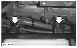 67 僅適用于 D13B-A/C/G/H/K/L,D13C2-A,D13C4-A(雙渦輪增壓器)如圖示將軟管夾緊固到位(以在裝配發(fā)動機(jī)時緊固/松開它們)。檢查冷卻劑管和軟管,確保其不與增壓空氣冷卻器后面的任何部分發(fā)生摩擦。