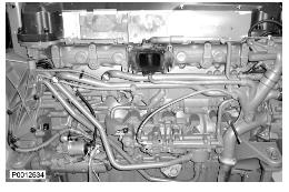17 僅適用于 D13B-A/C/G/H/K/L,D13C2-A,D13C4-A(雙渦輪增壓器)安裝將隔熱罩固定到歧管上的兩個(gè)螺栓和墊片(1)。不要完全緊固螺栓。安裝將隔熱罩側(cè)面固定到其下部的螺栓。用中心螺栓夾緊輸油軟管(2)。不要完全緊固螺栓。
