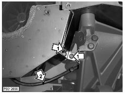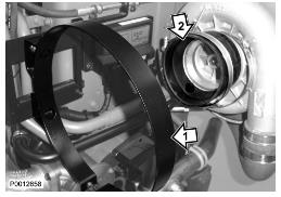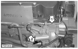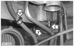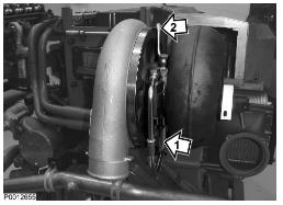 24 僅適用于 D13B-A/C/G/H/K/L,D13C2-A,D13C4-A(雙渦輪增壓器)緊固下部渦輪增壓器隔熱罩上的兩個(gè)螺栓(1)。將水軟管(2)夾緊至回油管上。