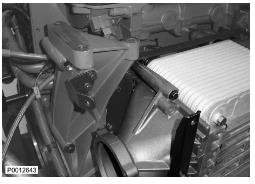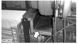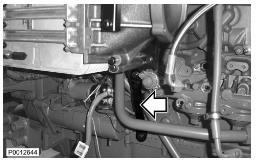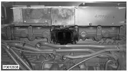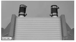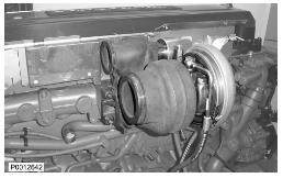 11 僅適用于 D13B-A/C/G/H/K/L,D13C2-A,D13C4-A(雙渦輪增壓器)向上提升增壓空氣冷卻器并將軟管滑到冷卻軟管上。使用所有螺栓固定增壓空氣冷卻器。